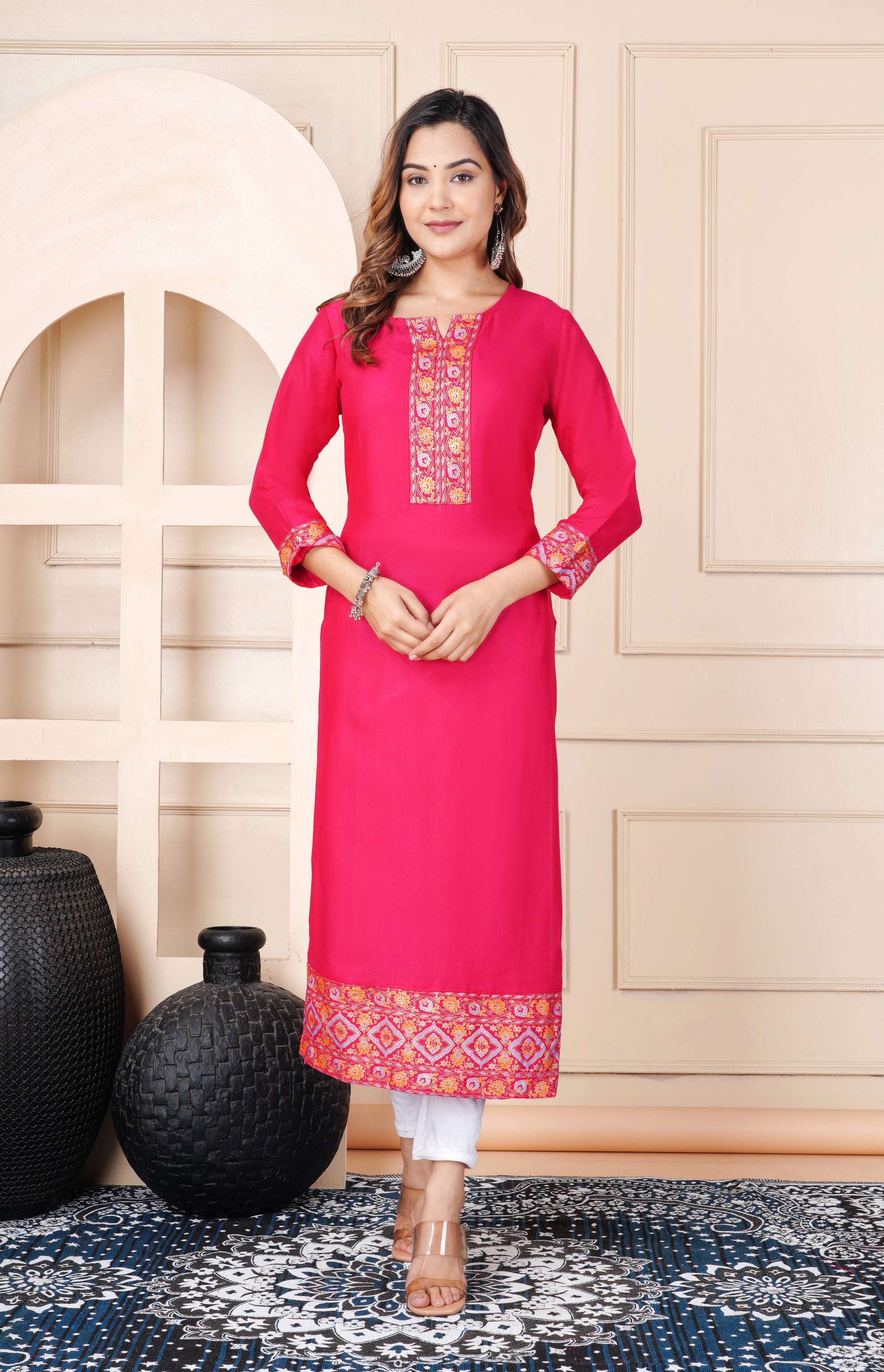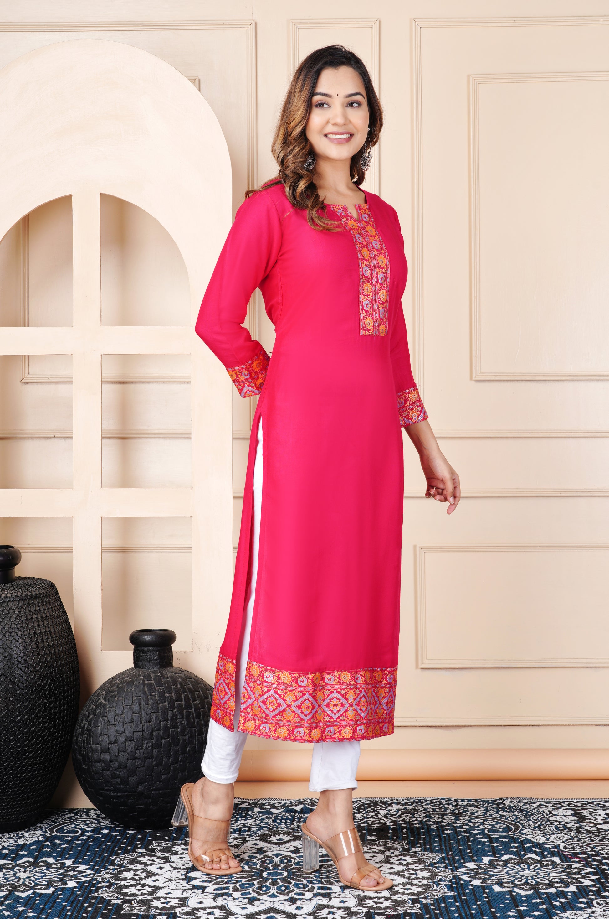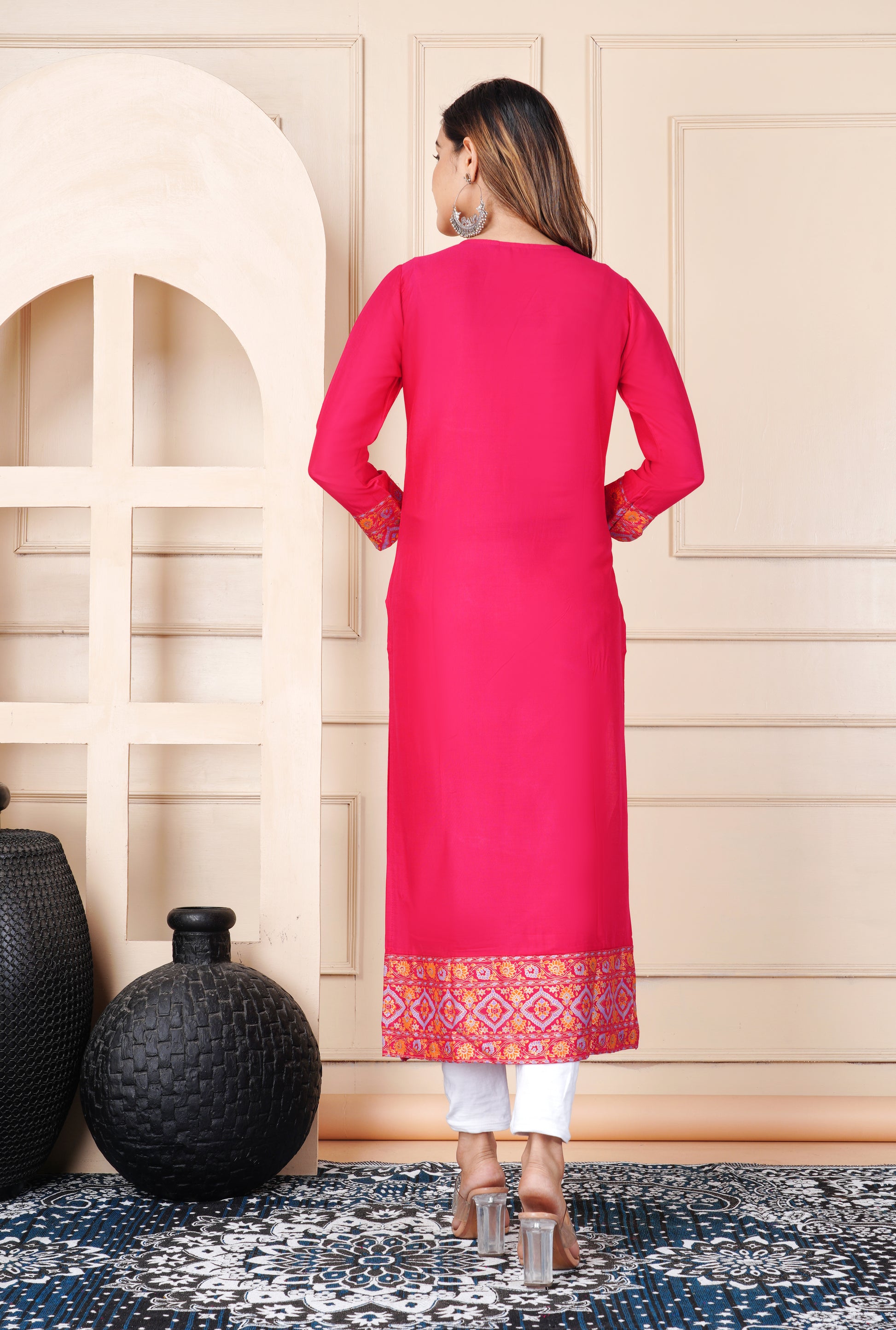 Women's Pink Straight Kurti with Ethnic Border Print | Stylish Long Kurta for Office, Casual & Festive Wear