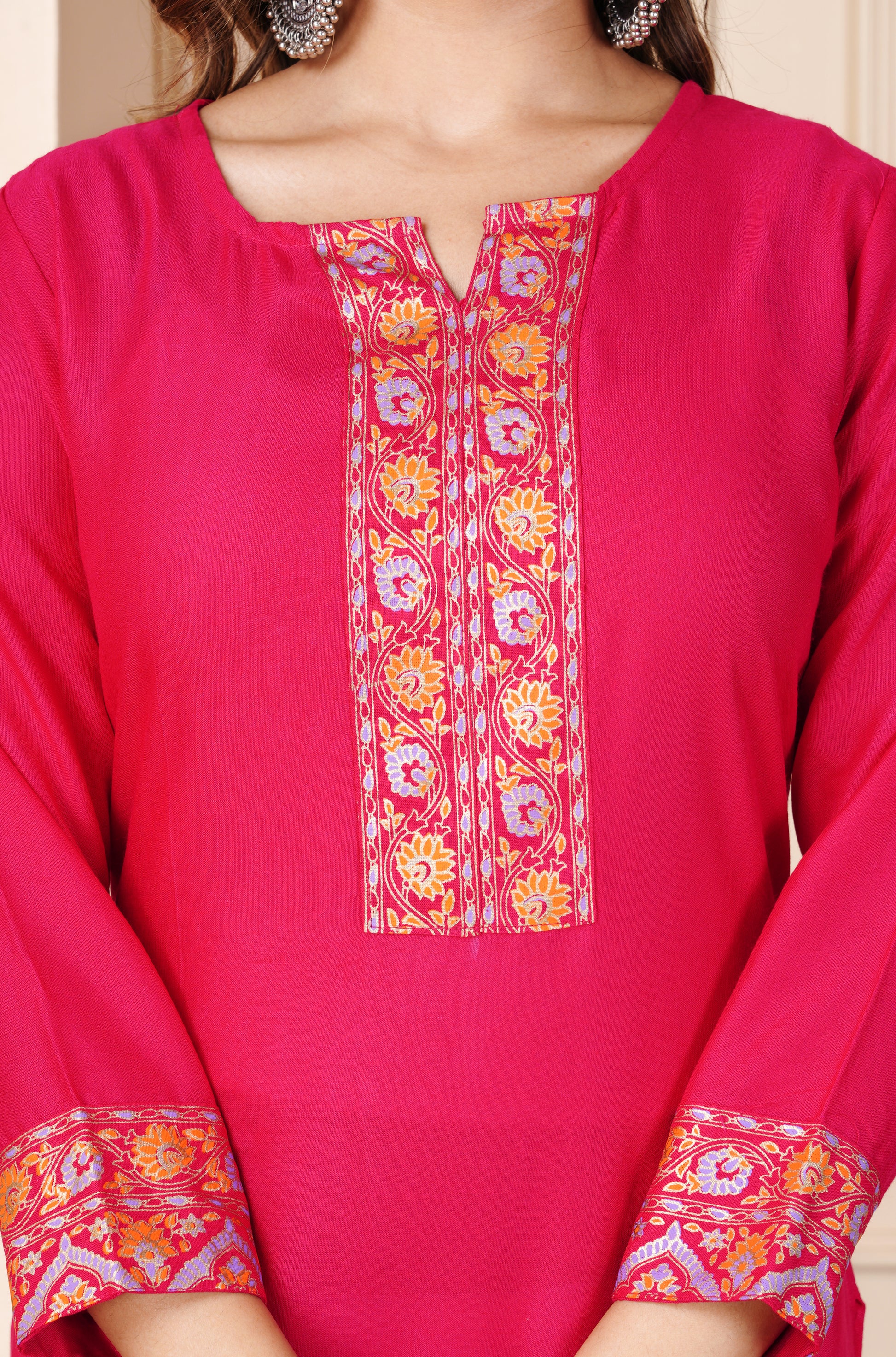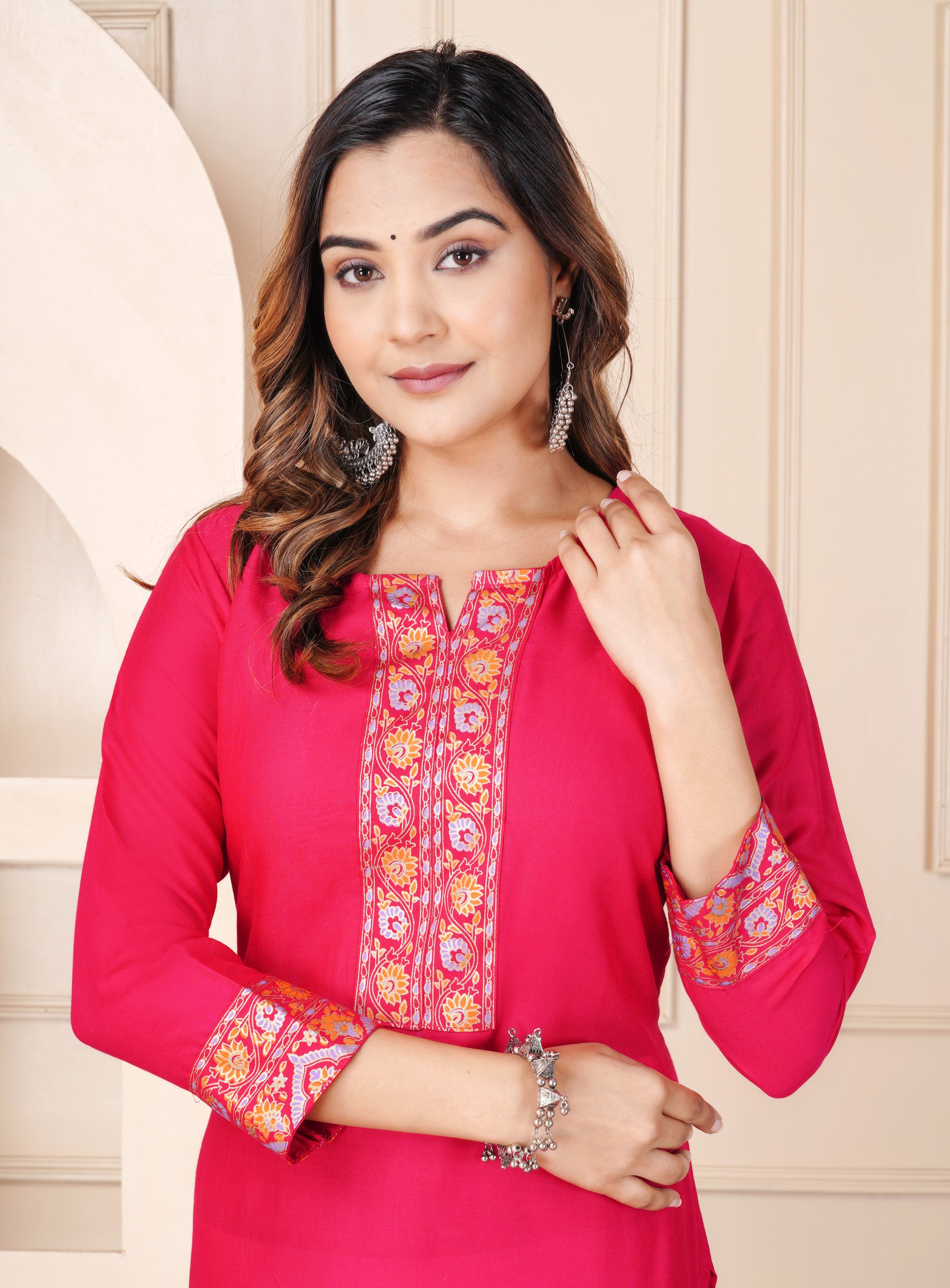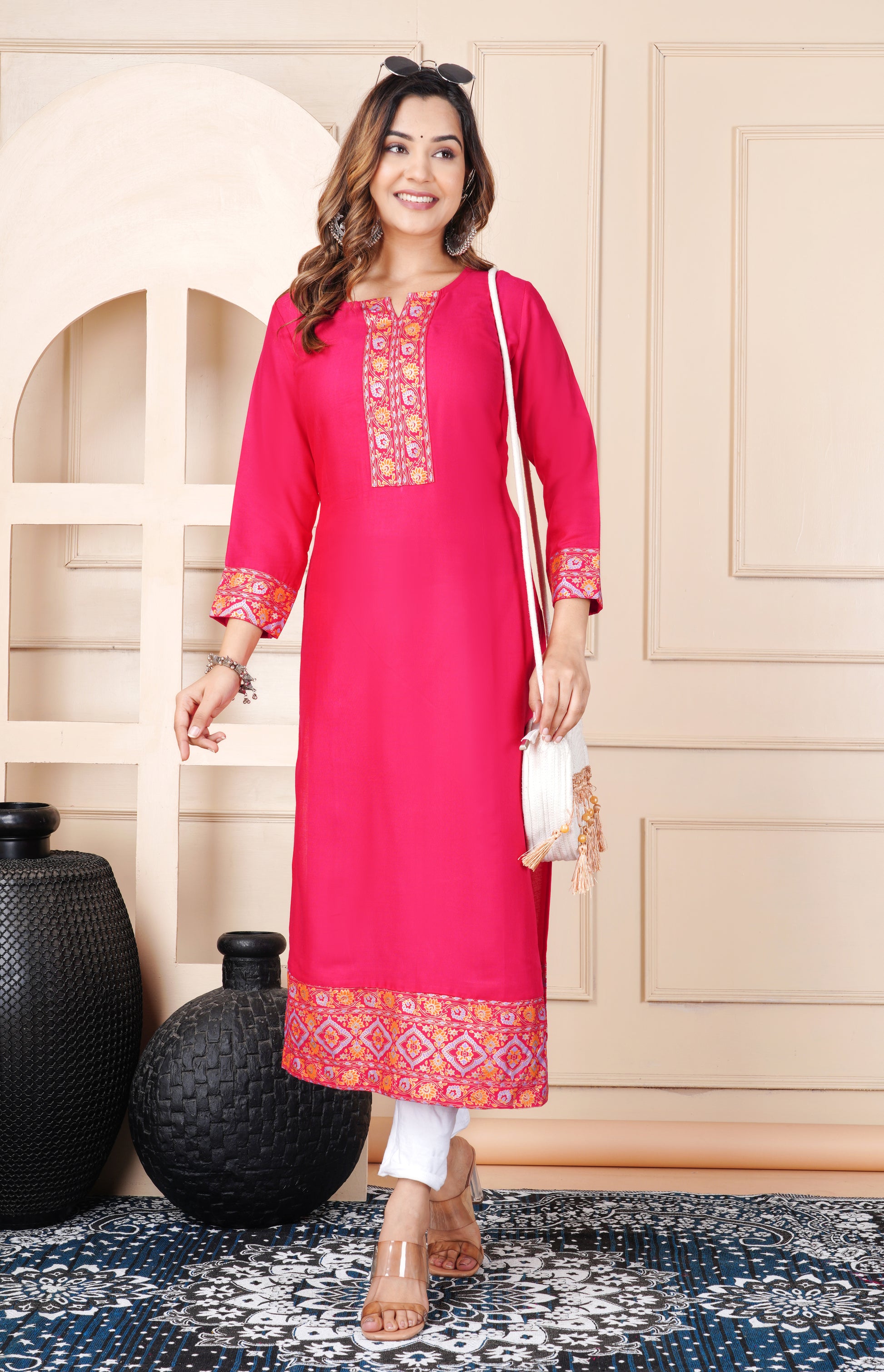 Upgrade your ethnic wardrobe with this elegant pink straight kurti, beautifully designed with ethnic border print on the neckline, sleeves, and hemline. Crafted from soft & breathable fabric, this kurta ensures all-day comfort while giving you a stylish traditional look.